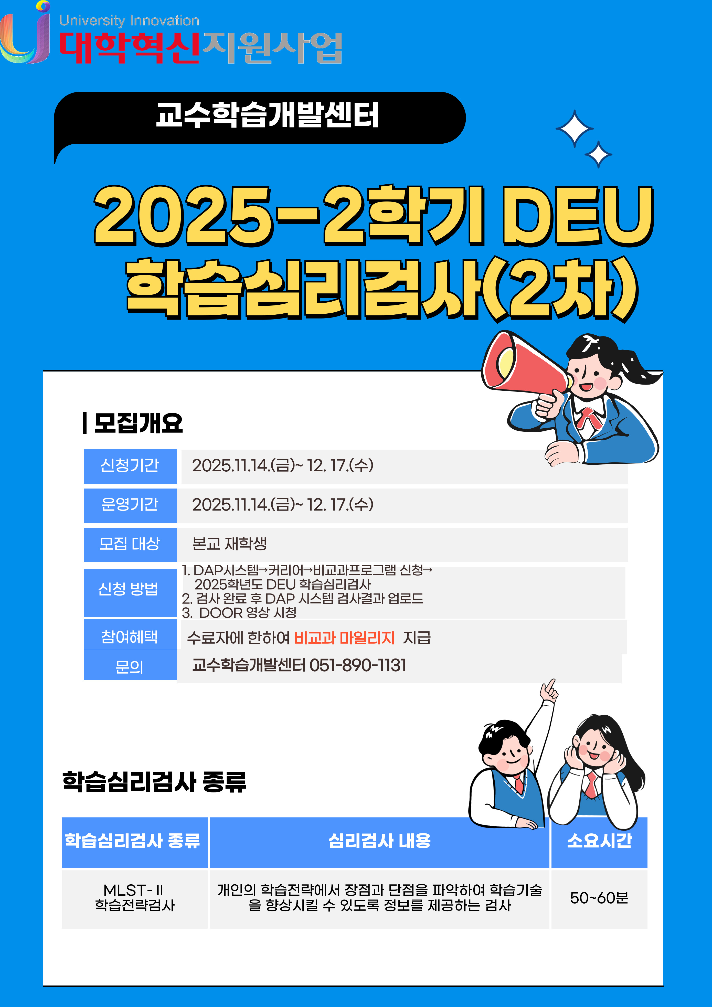 교수학습개발센터의 학습지원 프그램인 2025-2학기 DEU 학습심리검사(2차)를 다음과 같이 안내 하오니 많은 신청 바랍니다.